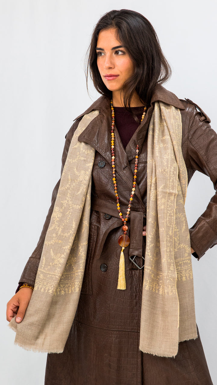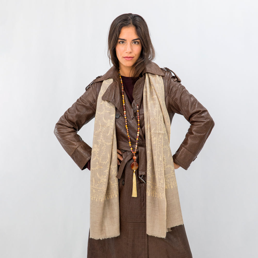 Beige awakened by the light of pale yellow embroidery, like a rising sun over the savanna.