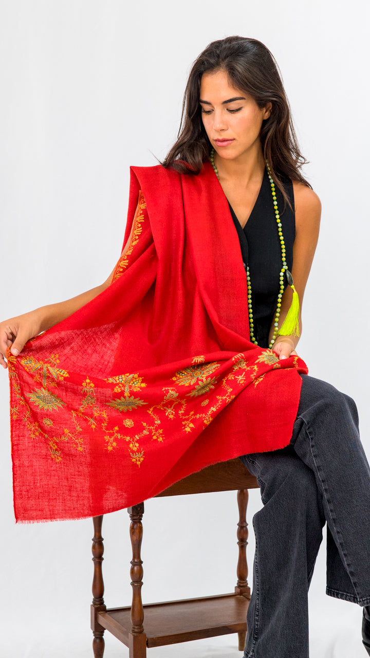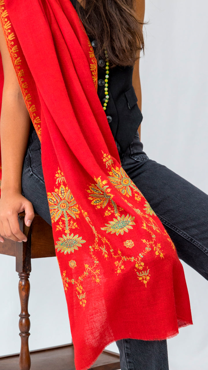 Red as passion, embroidered with dark green, lime, yellow, and orange, like a garden in full bloom.