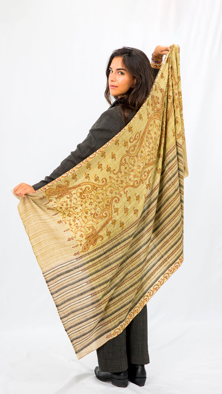 Embroidered stripes crisscross like pathways on a canvas of silk, weaving tales.